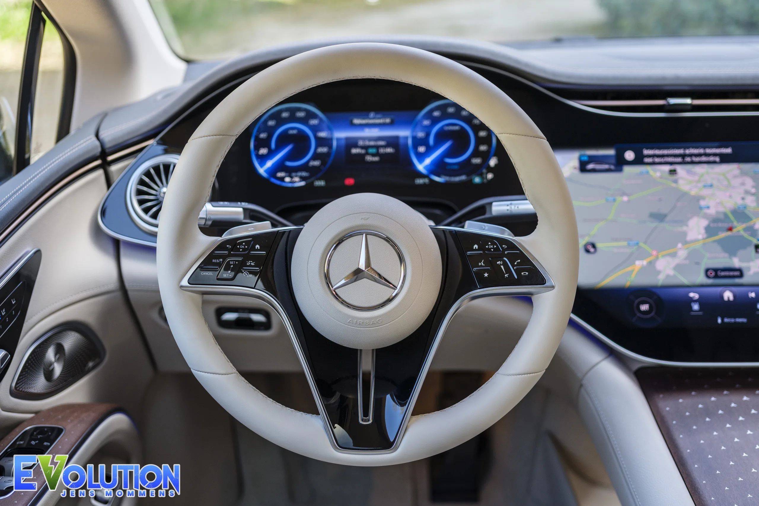 Op de weg is de Mercedes-Benz EQS het toppunt van Duits comfort. Door zijn gestroomlijnde vorm weten de Duitsers het windgeluid al tot een minimum te beperken. Wat toch nog zou doorkomen, wordt tegengehouden door het optionele akoestische glas. Verder beschikt hij nog over luchtvering om onze oneffen Belgische wegen te compenseren. Met een lengte van 5223 mm en een wielbasis van 3210 mm is de EQS allesbehalve een kleine wagen. Parkeren of navigeren in de stad zou een heuse opgave worden, maar dat is buiten de meedraaiende achterwielen gerekend. Deze wagen rijdt uitstekend. Bovendien dwingt hij een rustig rijgedrag af, waardoor je automatisch trager gaat accelereren en iets sneller op de rem gaat.
